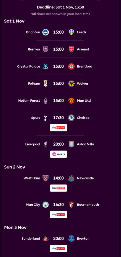 No early game, but 5 of the bad boys at 3pm on Saturday; Brighton v Leeds, Burnley v Arsenal, Palace v Brentford, Fulham v Wolves and Forest v Man Utd.