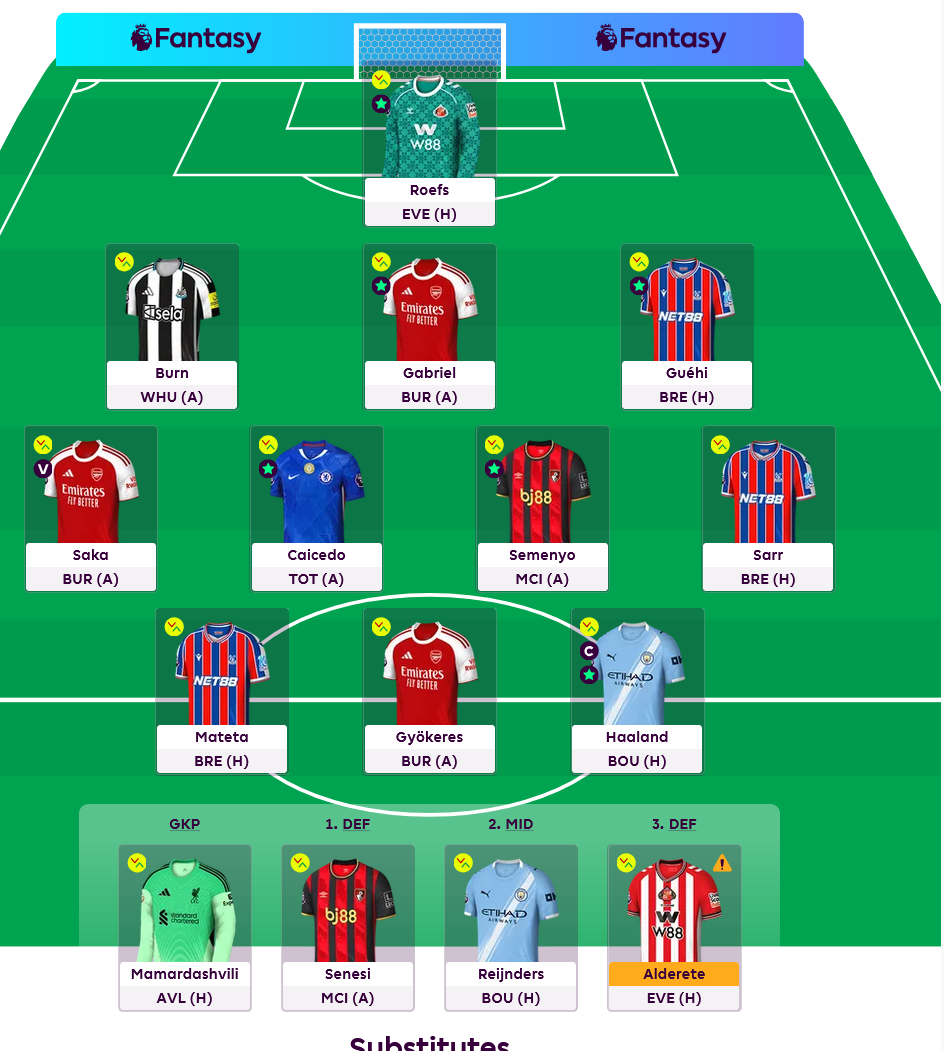 Sunday has 4 games crammed in at 2pm; Arsenal v Crystal Palace, Aston Villa v Man City, Bournemouth v Forest and Wolves v Burnley. Before Everton and Spurs round the GW off at 4.30pm.