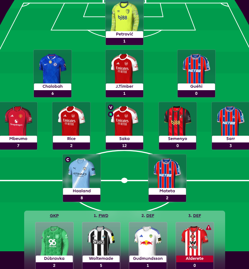 ugh I just realised Woltemade won’t be coming in as Semenyo is on 0pts as he missed a penalty wiping out his points, so it’s only 1pts coming in from Gudmundsson, and with a total of 43pts this is my second lowest score so far this season, the lowest being 40pts (GW3).