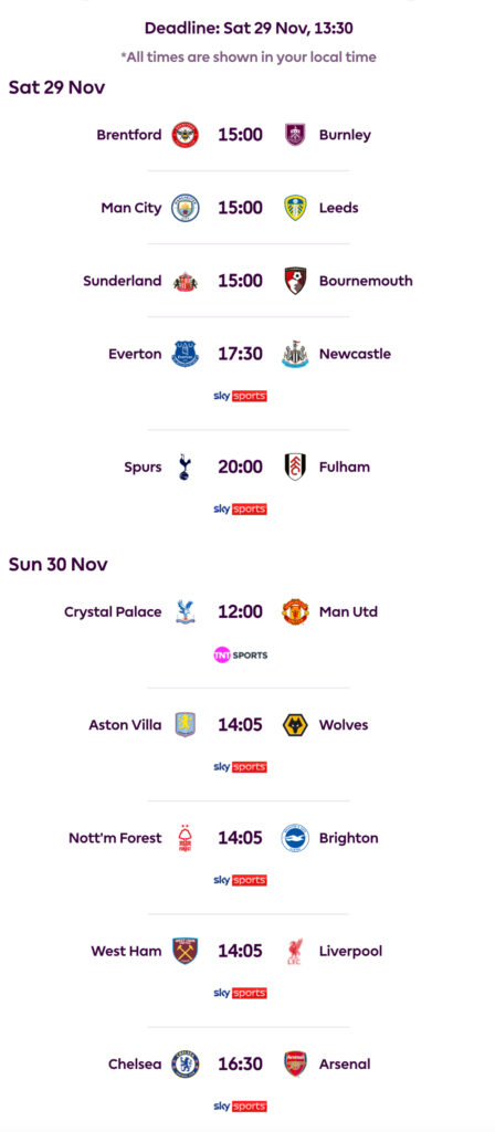 You can have a lie in on Saturday as the games don’t begin until 3pm with Brentford v Burnley, Man City v Leeds and Sunderland v Bournemouth. Everton and Newcastle fill a gap at 5.30pm before we have late night entertainment as Spurs host Fulham at 8pm.