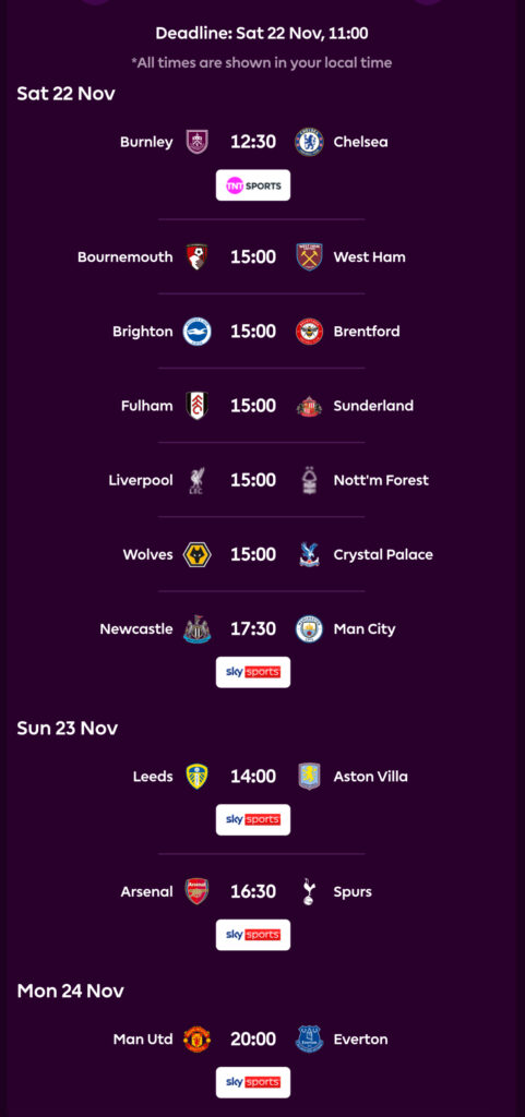 Burnley and Chelsea get us under way at 12.30pm. We then have 5 games at 3pm; Bournemouth v West Ham, Brighton v Brentford, Fulham v Sunderland, Liverpool v Forest and Wolves v Palace. Newcastle and Man City bring up the rear ast 5.30pm.