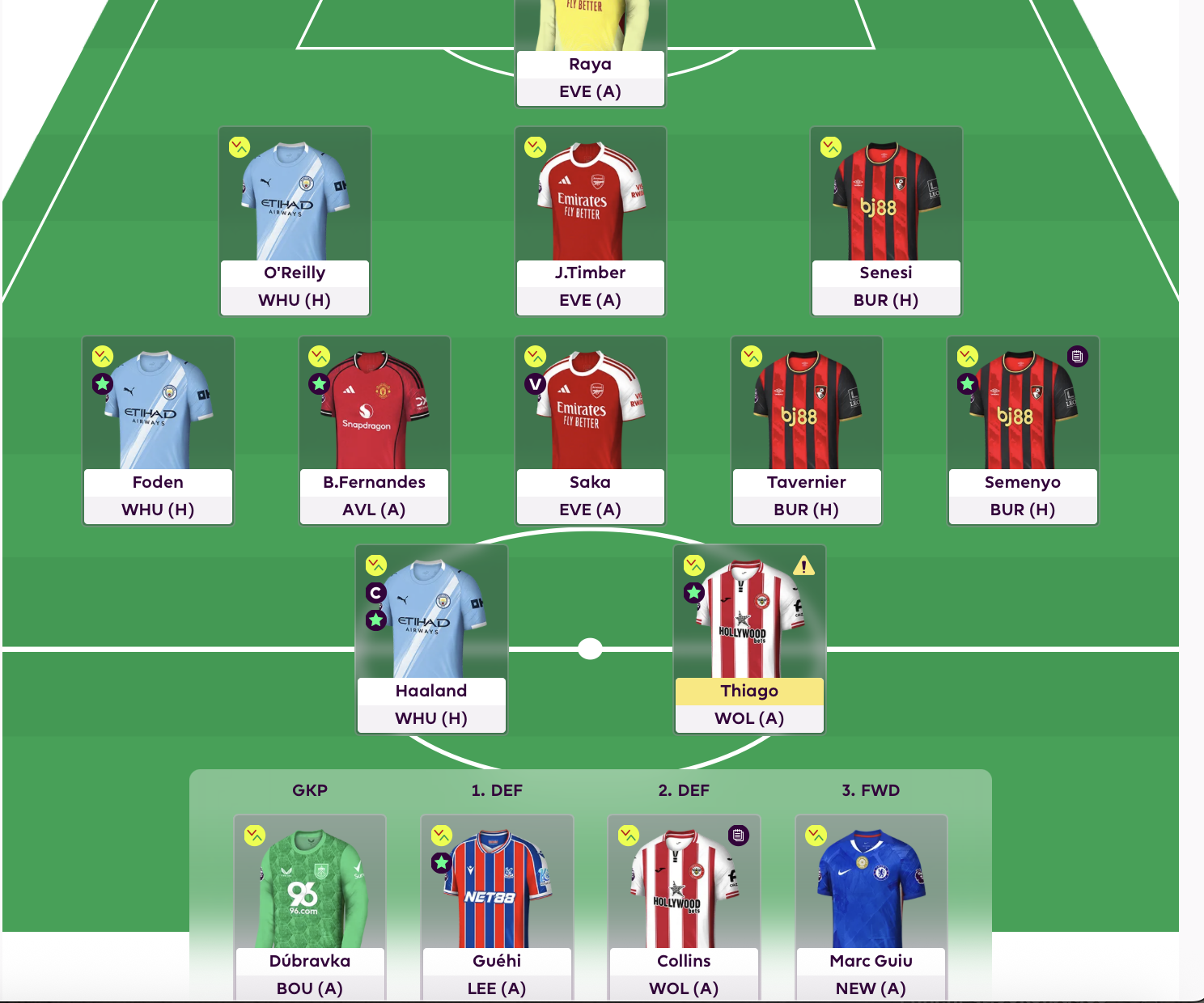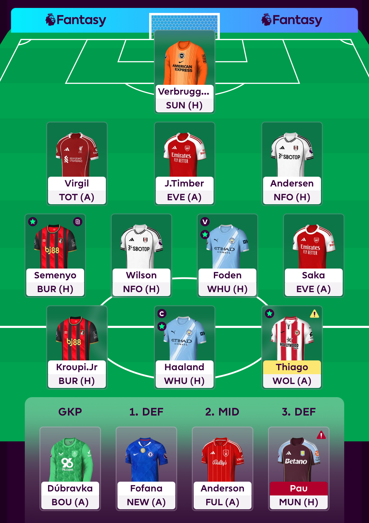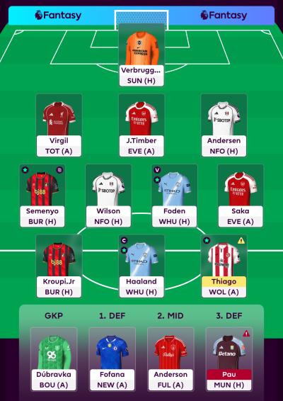 Maybe Brighton player(s) somewhere. That match looks to be to their advantage and Thiago is flagged. You could have the Brighton player on the bench just in case Thiago doesn’t come on. Otherwise looks like a great team for this week.