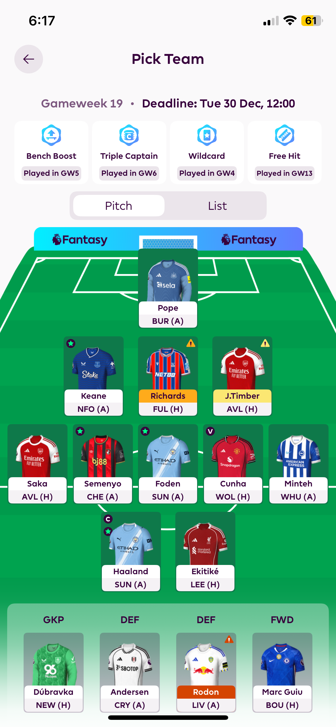 Rodon is out, not sure if Pope starts, I need at least one of Timber or Richards to start to field 11 players this week. Semenyo now also a concern with his move to Mancity close to being finalized.