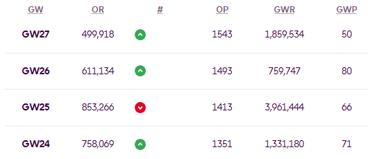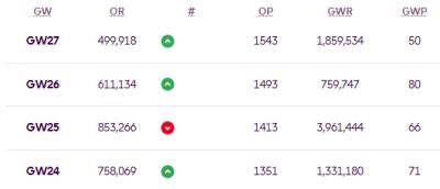 Same here ODT. Have spent the season yo-yoing and 3 good weeks have put me in the 500k range. Slight red this week miffed me slightly but still looking to advance at end of the season. Would love to get inside the top 100k, but realistically the FPL gods will have something to say about this!