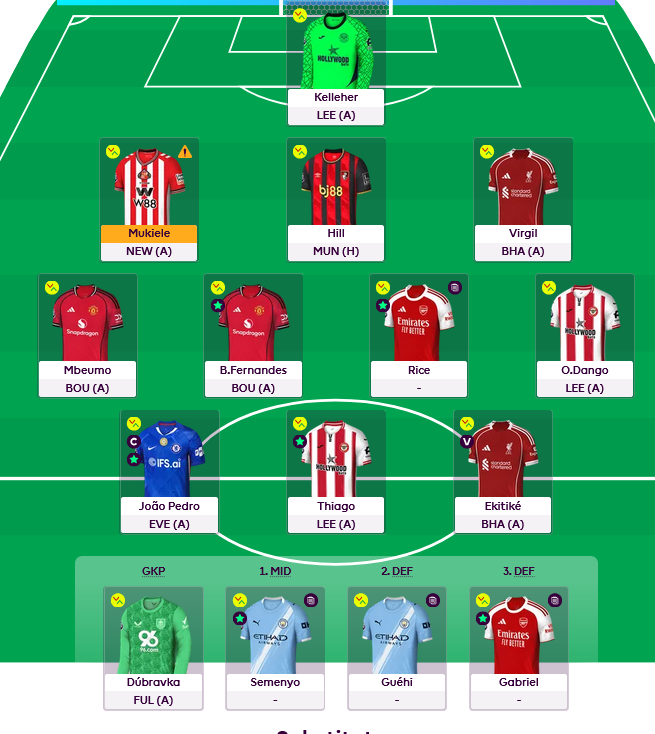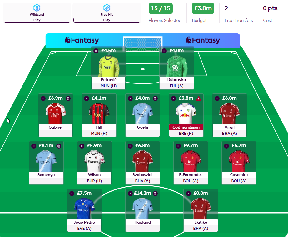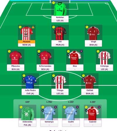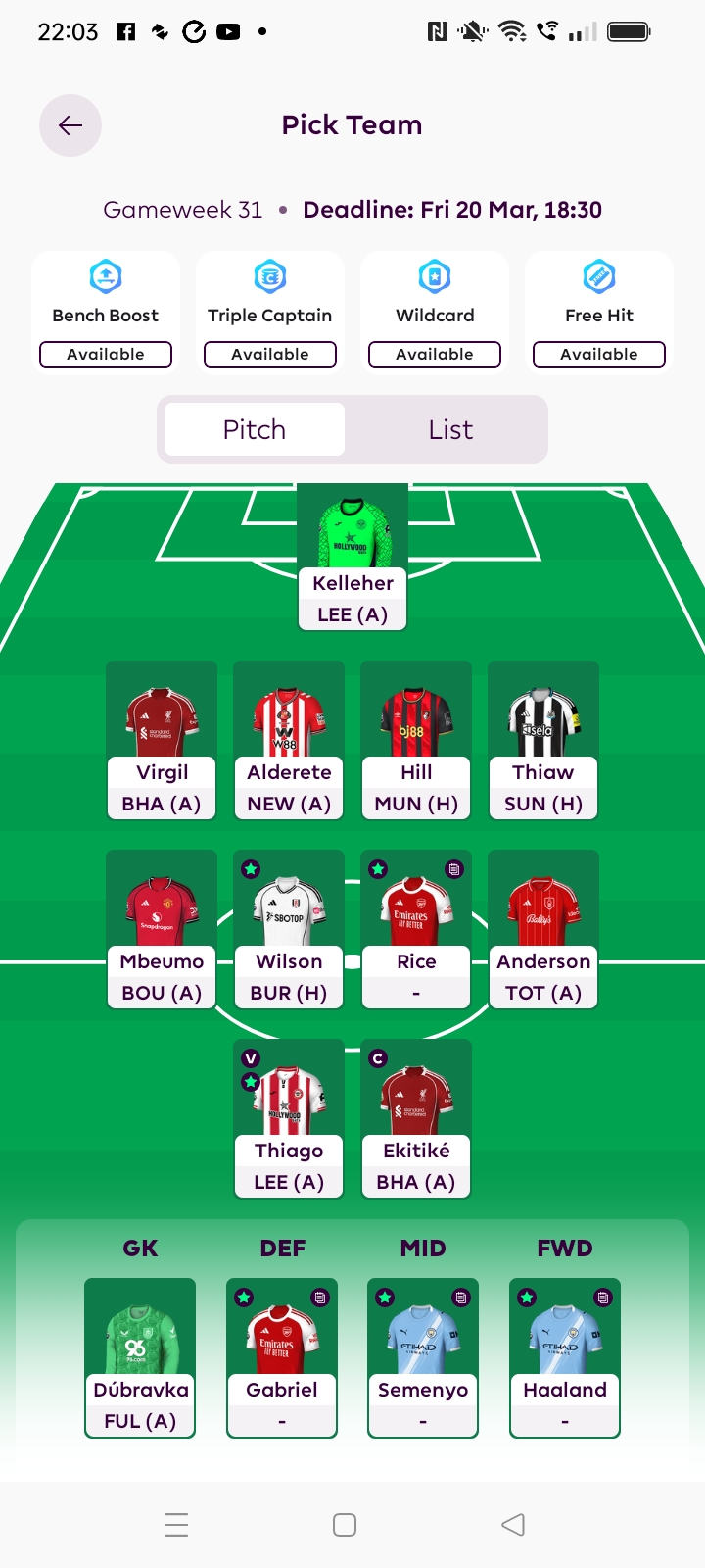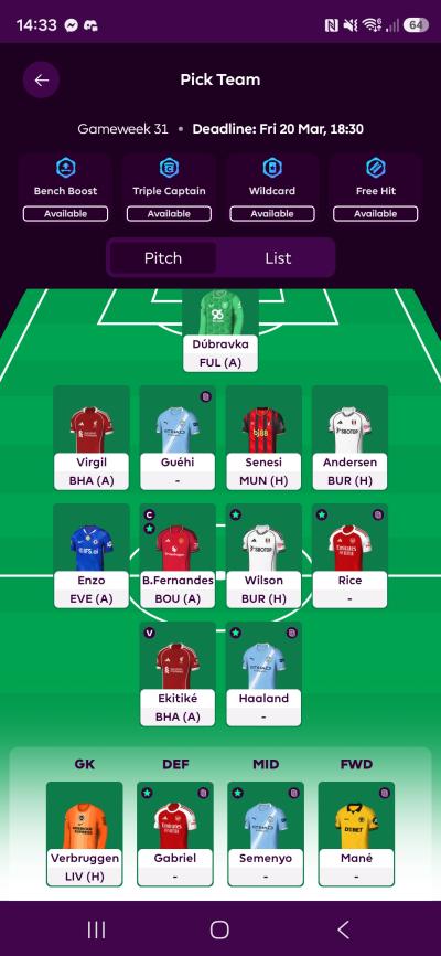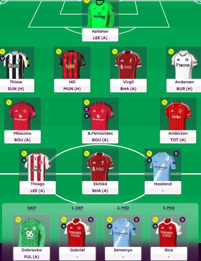 Sounds good HF! I might take out 2 of my 4 FTs (+ 6.4m ITB) to get to where you are, ie. Rice + Mukiele> Wilson + Thiaw. I’ve pottered (call me Graham!) about and it still gives me enough cash to get back in Haaland (probably for Ekitike when the moment is right) with some change!