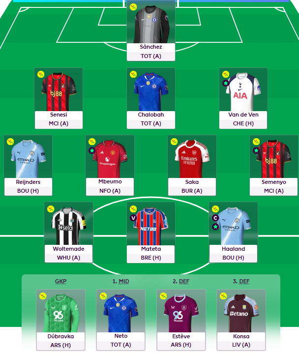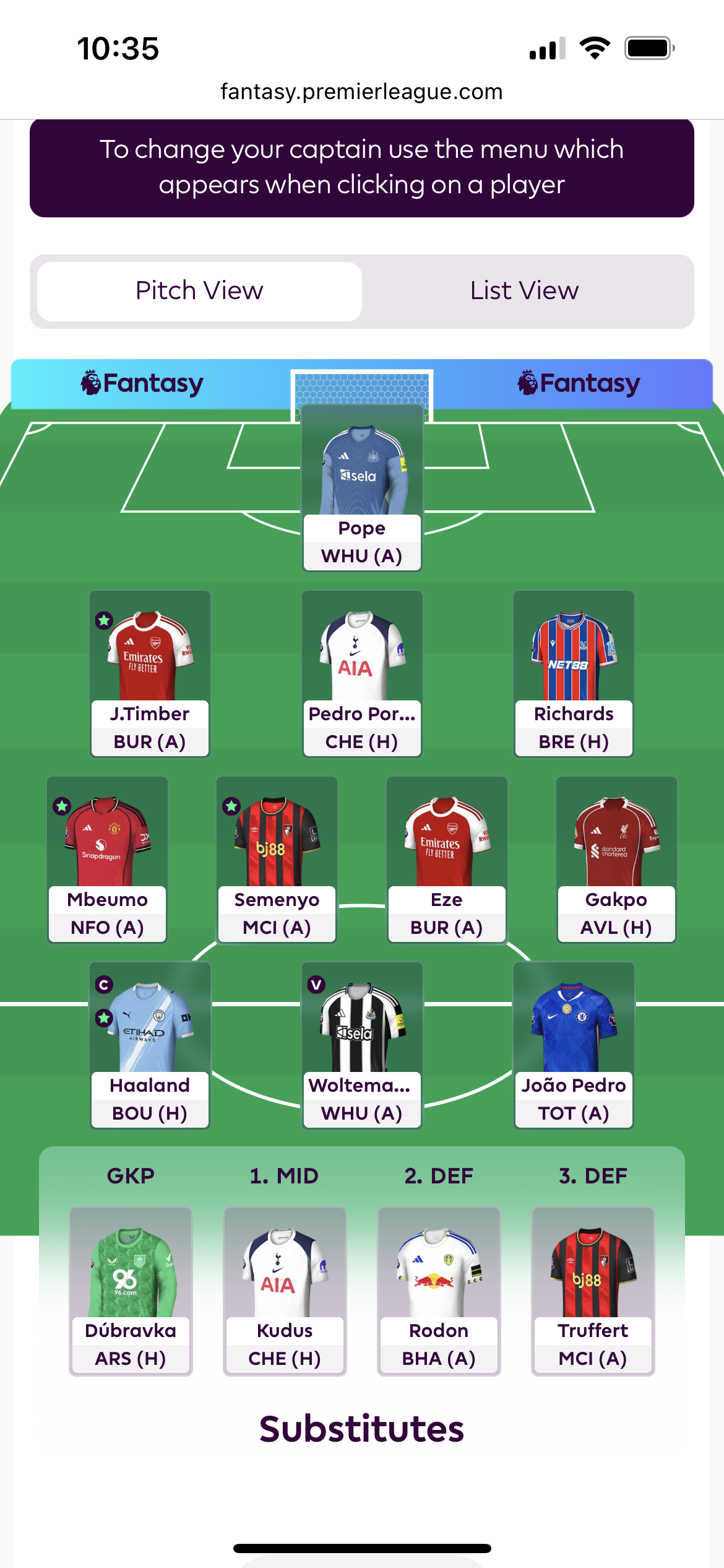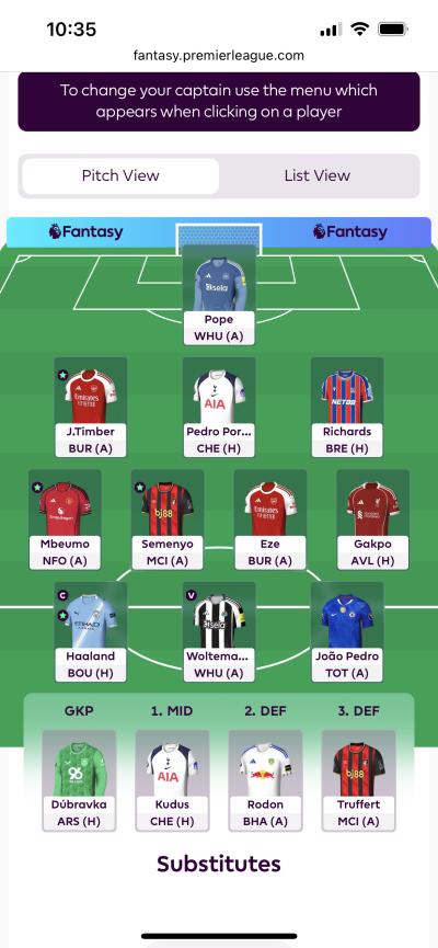Any it’s? I got rid of Pedro. Mateta missing in your team. Pope, Timber, Richards, Mbeumo, Sem, Gakpo, Haaland and Wolte all look good.
