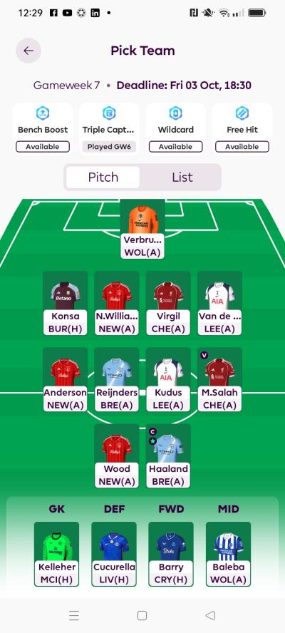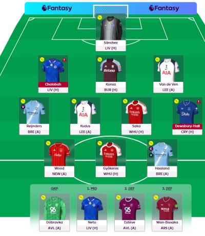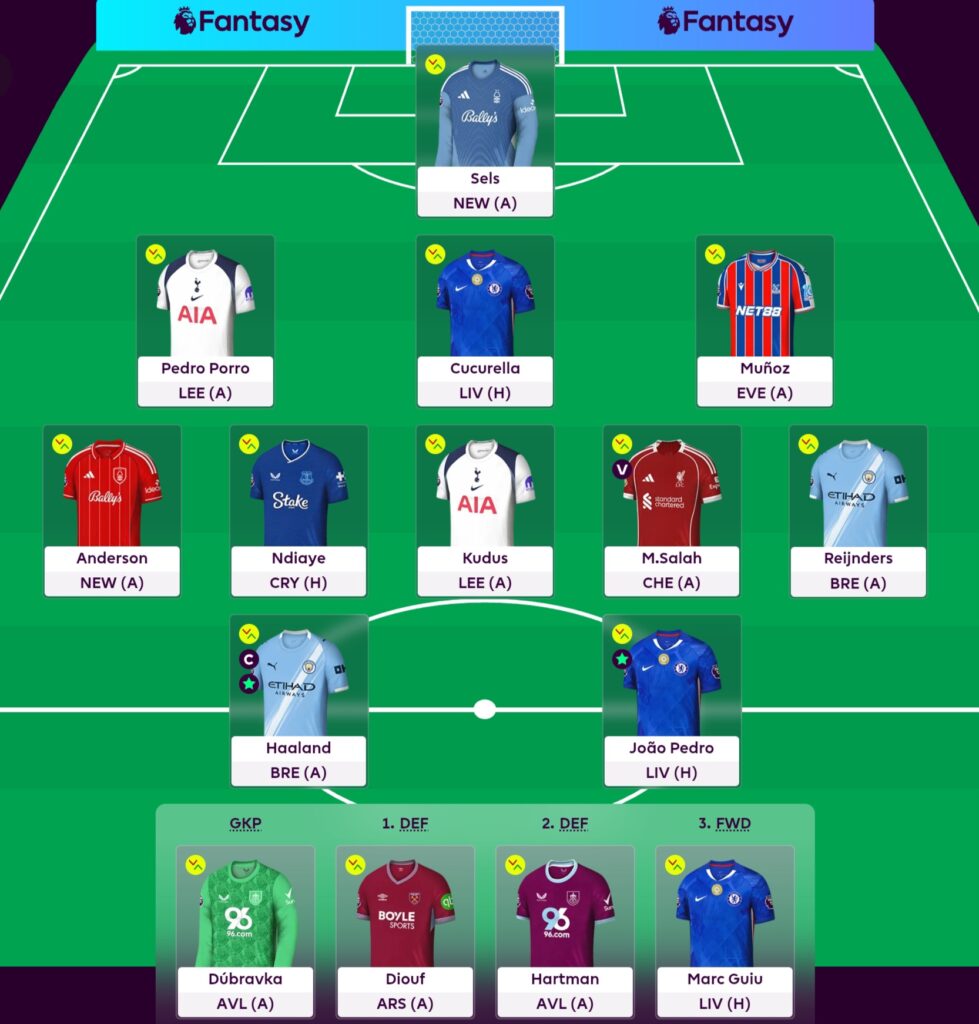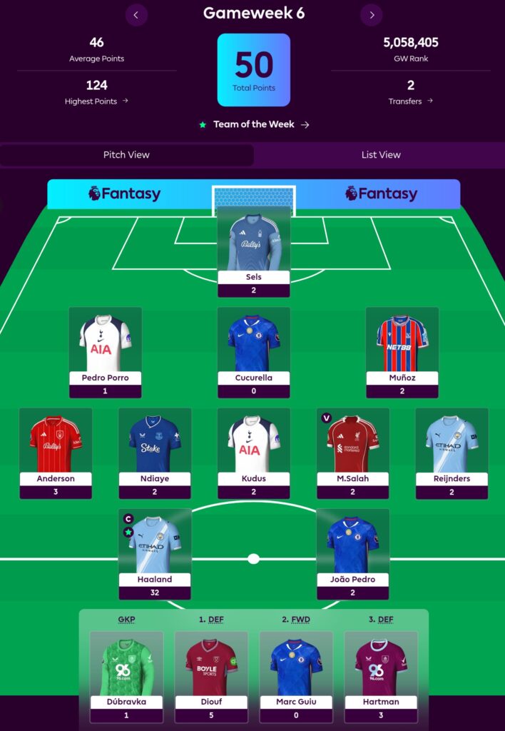 We finished on 50 points which was just above the average but 32 of those came from our captain. The rest of the team was full of 1’s and 2’s with Cucurella getting 0 and Anderson getting 3 to buck the trends.
