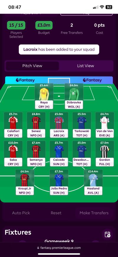 Lacroix has awesome fixtures after Arsenal. I would only swap him out for an upgrade to Munoz. Richards and Guehi are cheaper alternatives. Guehi really outscored himself so far this season. Munoz is awesome so if you can get any, get him. If I can’t get him I’ll go for the cheap option in Richards. But you already have Lacroix, so keep, I would say.