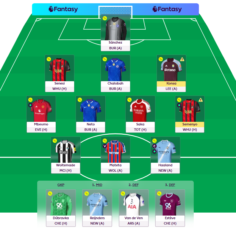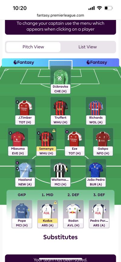 Saka’s 12-pointer generously papered over the cracks of what was otherwise a damp squib of a week. We scraped a pair of clean sheets at the back, captain Haaland decided to miss a penalty just for the drama but still found the net, and despite Newcastle’s latest away-day implosion, Woltemade kindly chipped in with 5 points.
