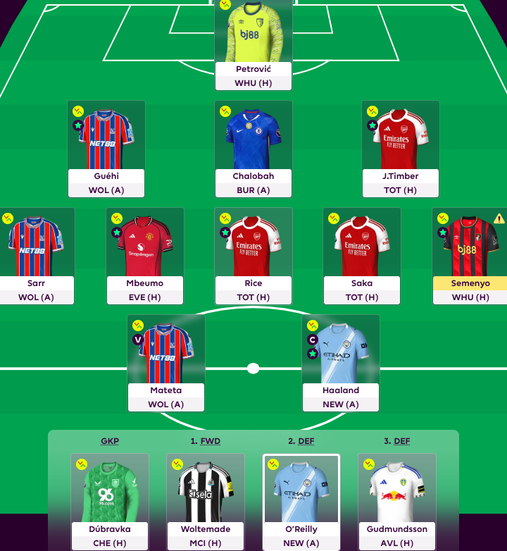 Saka’s 12-pointer generously papered over the cracks of what was otherwise a damp squib of a week. We scraped a pair of clean sheets at the back, captain Haaland decided to miss a penalty just for the drama but still found the net, and despite Newcastle’s latest away-day implosion, Woltemade kindly chipped in with 5 points.