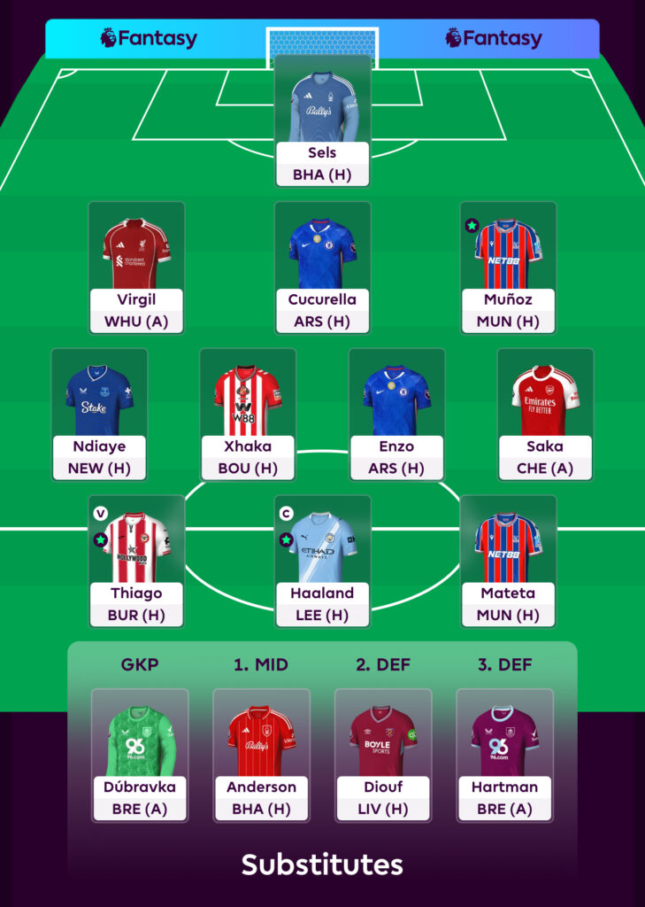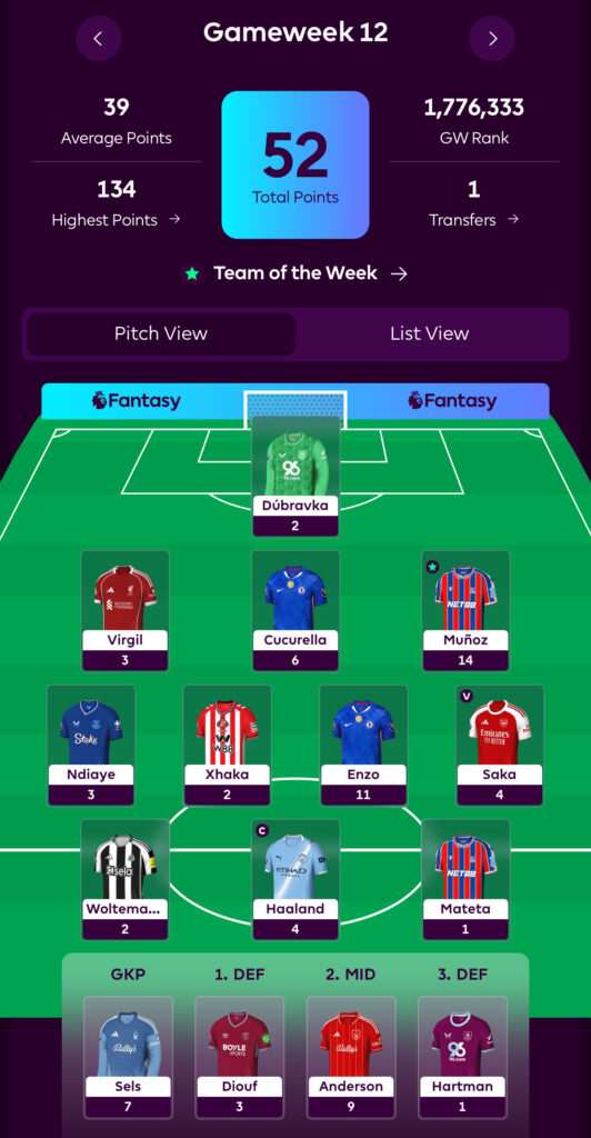 Probably fair to say that that was a bit of an odd week all round. And that was almost certainly reflected in our own score, or rather the scorers. Whilst our front 3 of Haaland (C), Woltemade and Mateta, along with the likes of Saka, did bugger all, our points all came from Munoz and Enzo with a goal apiece and Cucurella with a cleanie.
