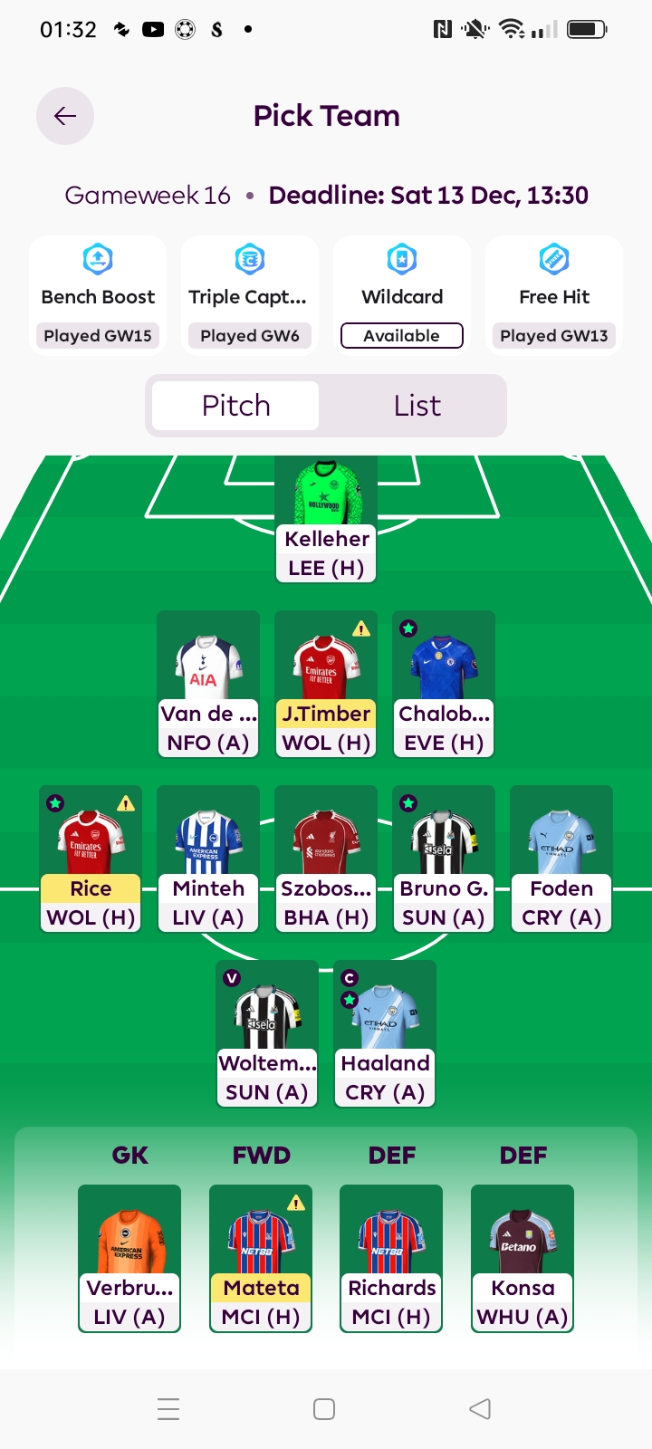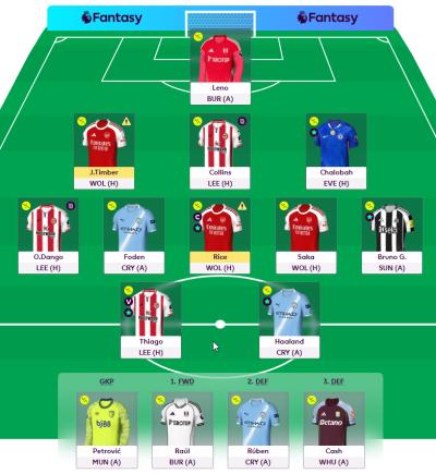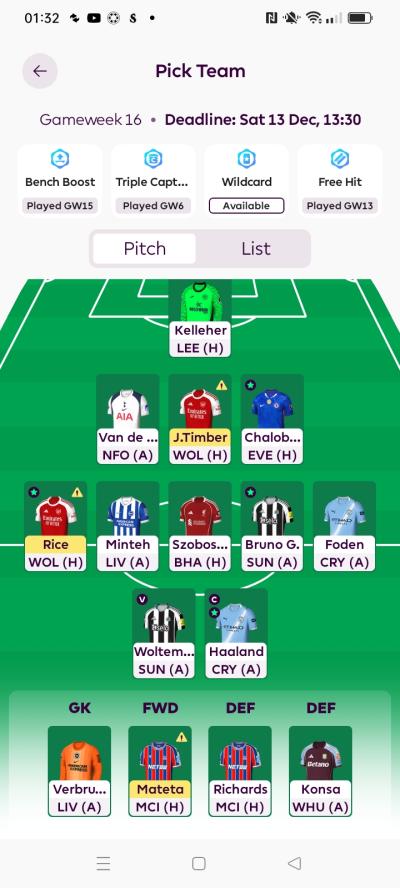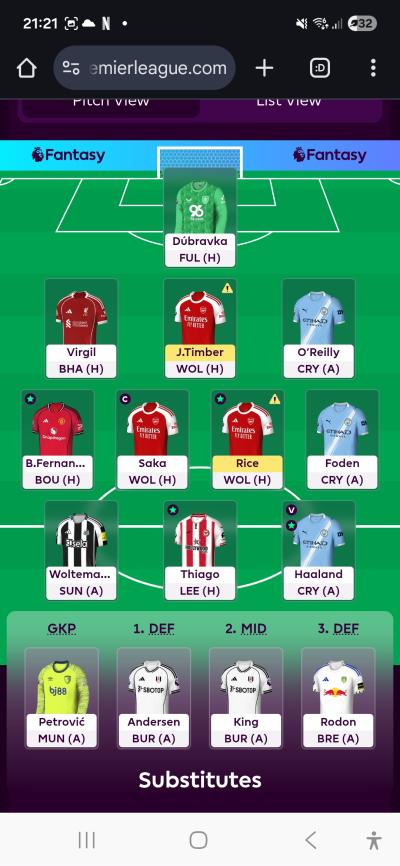 In Arteta’s press conference, he said Rice wanted to play the Champions League match, but Arteta said he decided to give him a rest, so, he will likely play, same with Timber. As a back-up in case Arteta rests Timber (It’s only Wolves), maybe move Konsa ahead of Richards on the bench. Mateta to Thiago makes sense, but who will you bench as Minteh may produce vs Liverpool, will you have money to make Minteh into Bruno Fernandes if you swap Mateta for Dominic Calvert Lewin and Woltemade into Thiago?