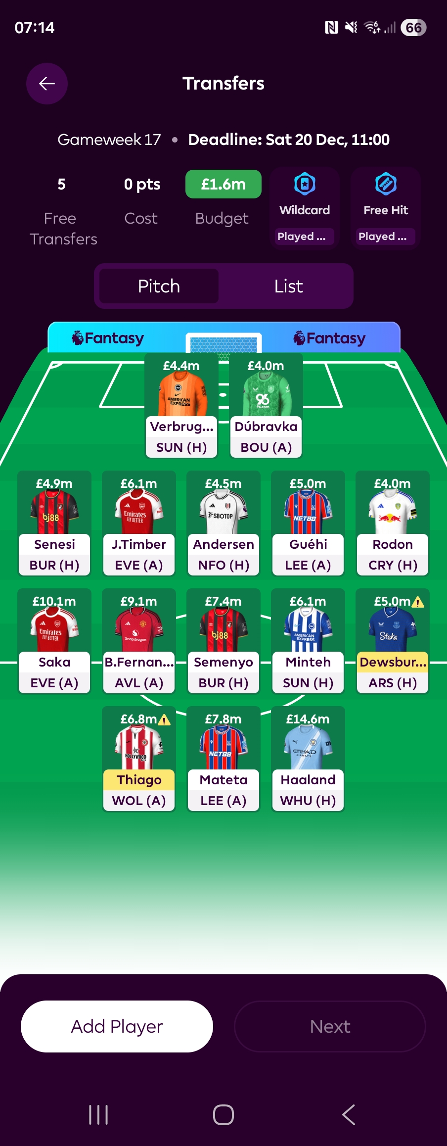 We have £01m in the bank and 1 free transfer to use ahead of GW17. Let’s go see what was decided….