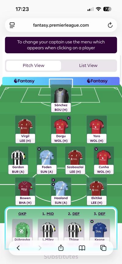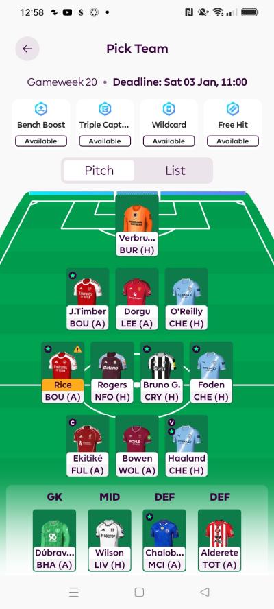 Would not ditch Rice, I think he may not play and Arteta will unleash him on Liverpool. Wilson can come in. Looks a short term thing in the case of Rice. O Reilly no official comments but there was a strange report on Manchester evening news that Guardiola was angered by something he was doing and subbed him off for Gvardiol. Reminds me a bit of the Rico Lewis episode last year and after that Rico never started. Would be nice if you could upgrade O Reilly to Nunes. And maybe start Alderete over Dorgu. Have a nasty feeling that Leeds are going to score at least a goal or two vs Man U