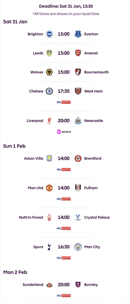No early game on Saturday so we begin with a trio at 3pm of Brighton v Everton, Leeds v Arsenal and Wolves v Bournemouth. Chelsea and West Ham are the sandwich filler at 5.30pm before a rare Saturday night treat of Liverpool v Newcastle.
