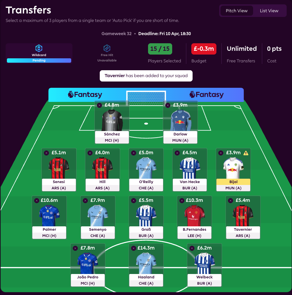 The Wildcard is now active, and we’ve landed on 14 doublers plus Bruno Fernandes. We’d likely have gone all-in with 15 if not for the small matter of Fernandes being the standout captain this week. Not owning him in recent weeks has cost us dearly, so this feels like an overdue correction. Or at least that’s what we’re telling ourselves.