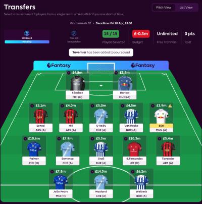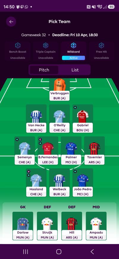 Re: The team below, I traded Ekitiké for Haaland (I have 2 more FTs and 2.2m up my sleeve for next GW) this week, and planning the BB for GW 33, and might get in O’Reilly, Palmer,, Petrovic and either Tavernier or Mitoma (for a -4 hit, or may add Darlow for a -8, but that’s going a bit far I think!). This will give me 9 doublers for the BB, and after GW 34 FH, we’ll play it by ear.