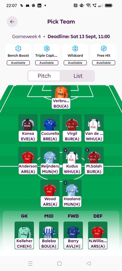 Here is my team for GW 4, on a WC and have 2m ITB. Funds for Isak.