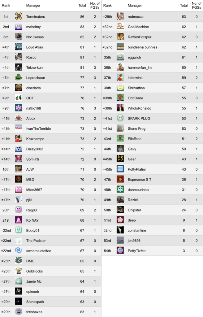 GW10 No FGS’ this week but some solid scores all the same. Tekno-kun and Loud Atlas took third with 11pts, sweetbluetoffee and mahelmy take second with 12pts, but it was oisedada who built on last week’s bronze, with this week’s gold; 14pts for the win and a solid effort across the two game weeks. One to watch!