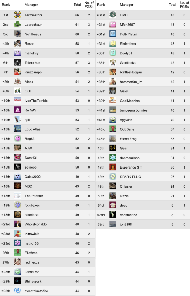 Some big scores this week, with 14pts setting the marker for bronze. Ivan and Terminators both came up with the goods and take their rightful place on the podium. Going one better with 15pts, we have Mahelmy in second. But way out in front with a smashing 18pts — and this week’s winner — is eplnoob! Bravo!