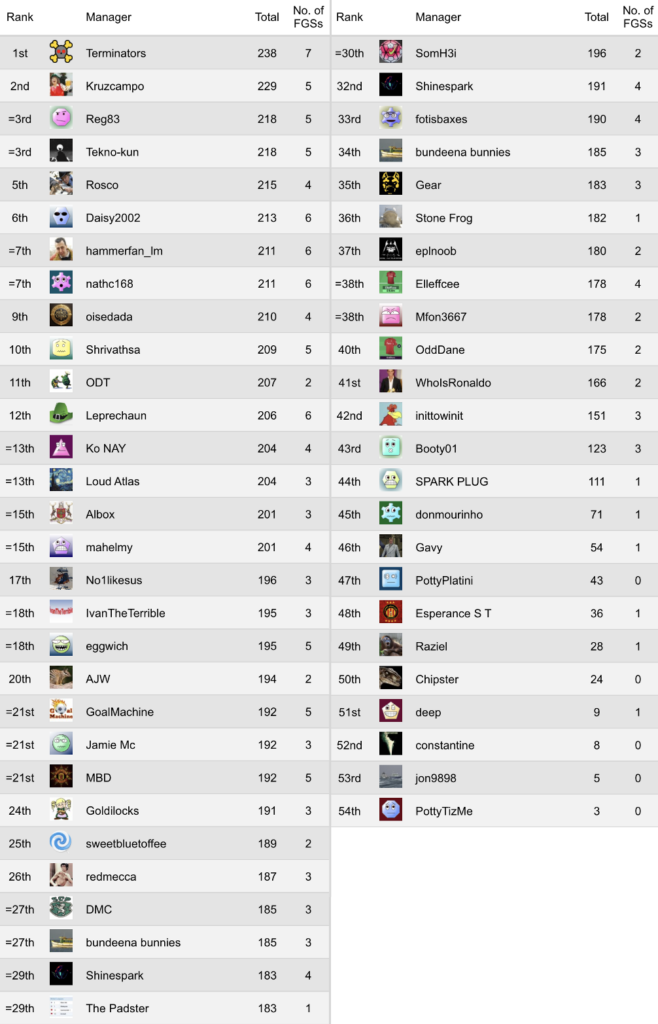 GW31 – Leprechaun was at it again, along with nathc168 and oisedada who all scored 9pts and took third once more on the podium. Ivan and GoalMachine took second with 10pts but it was Albox with 11pts who secured top-spot back in GW31. All barring Albox and oisedada also correctly guessed the FGS.