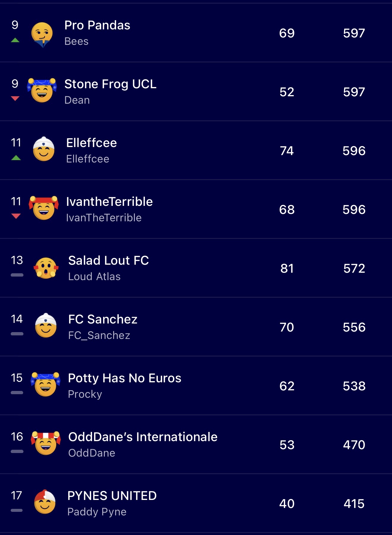 Deadlines are subject to change and will be at the time of kick-off of the first match of the matchday. So unlike FPL you do get to see the line-ups in advance and adjust accordingly. Just be aware that all 6 GW’s in the group stages now kick off with two early games so the deadline each time is 5.45pm UK time. Which also means you get to see the team sheets for four teams, not the full lot as in previous (and better!) seasons.