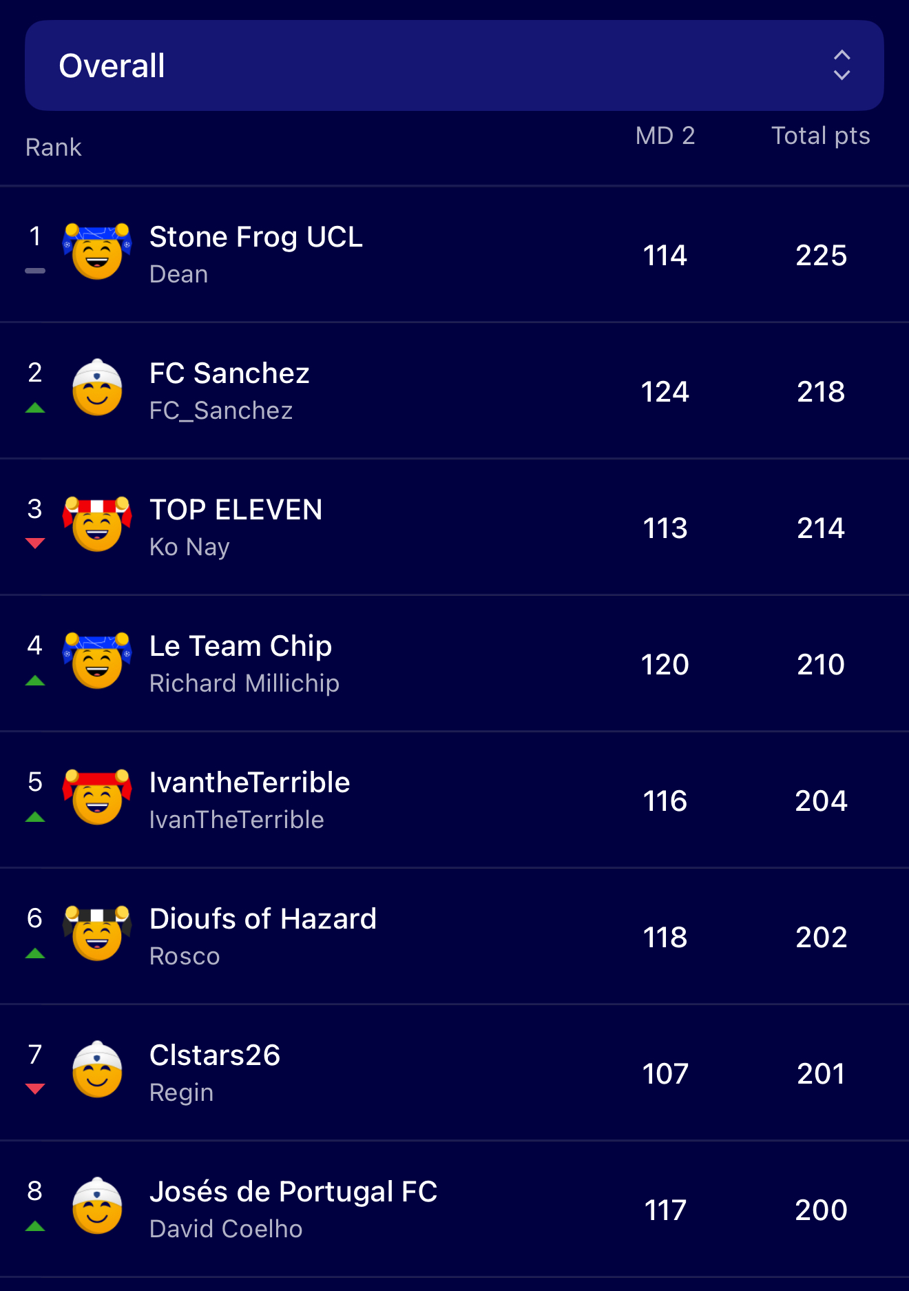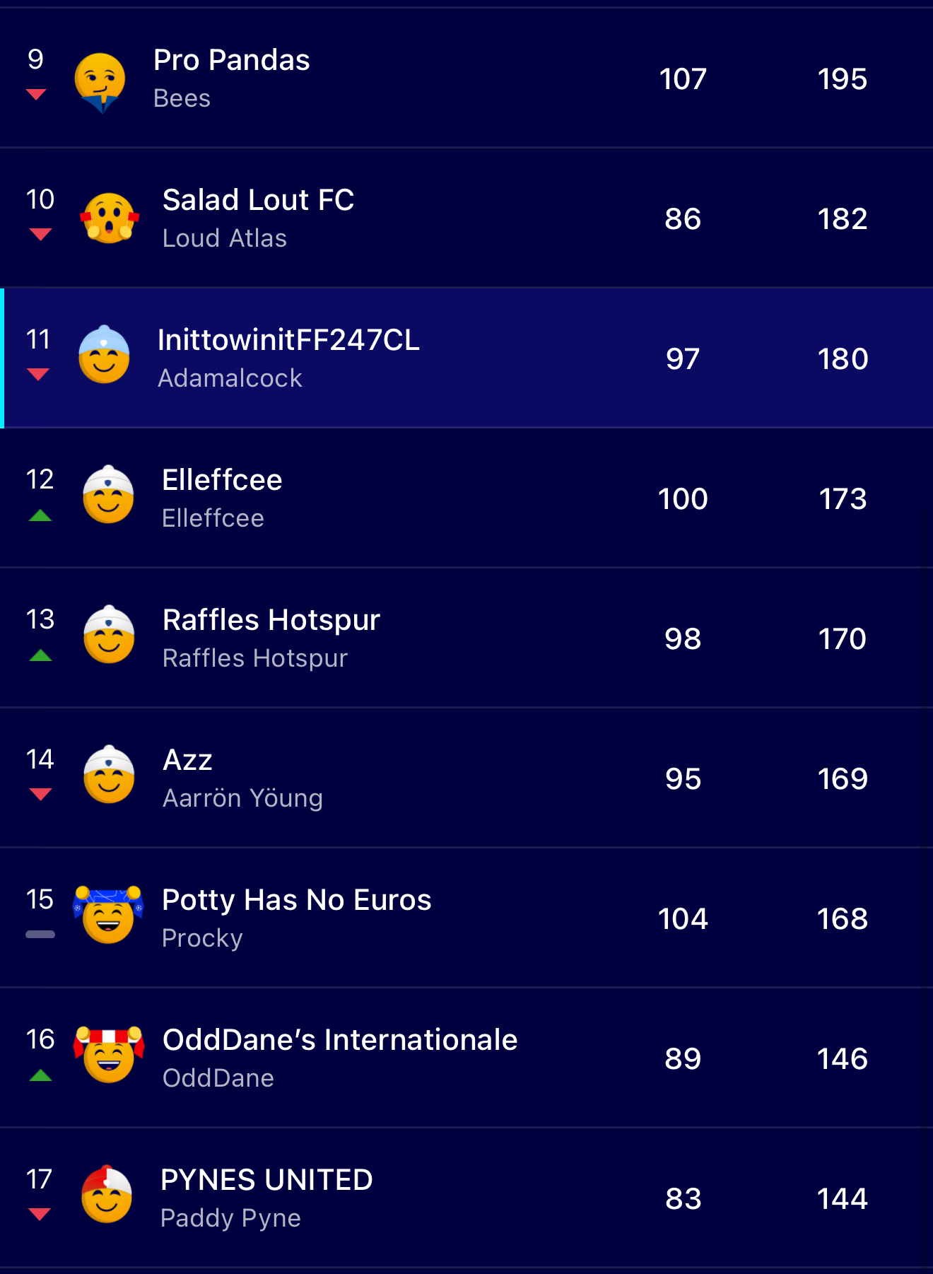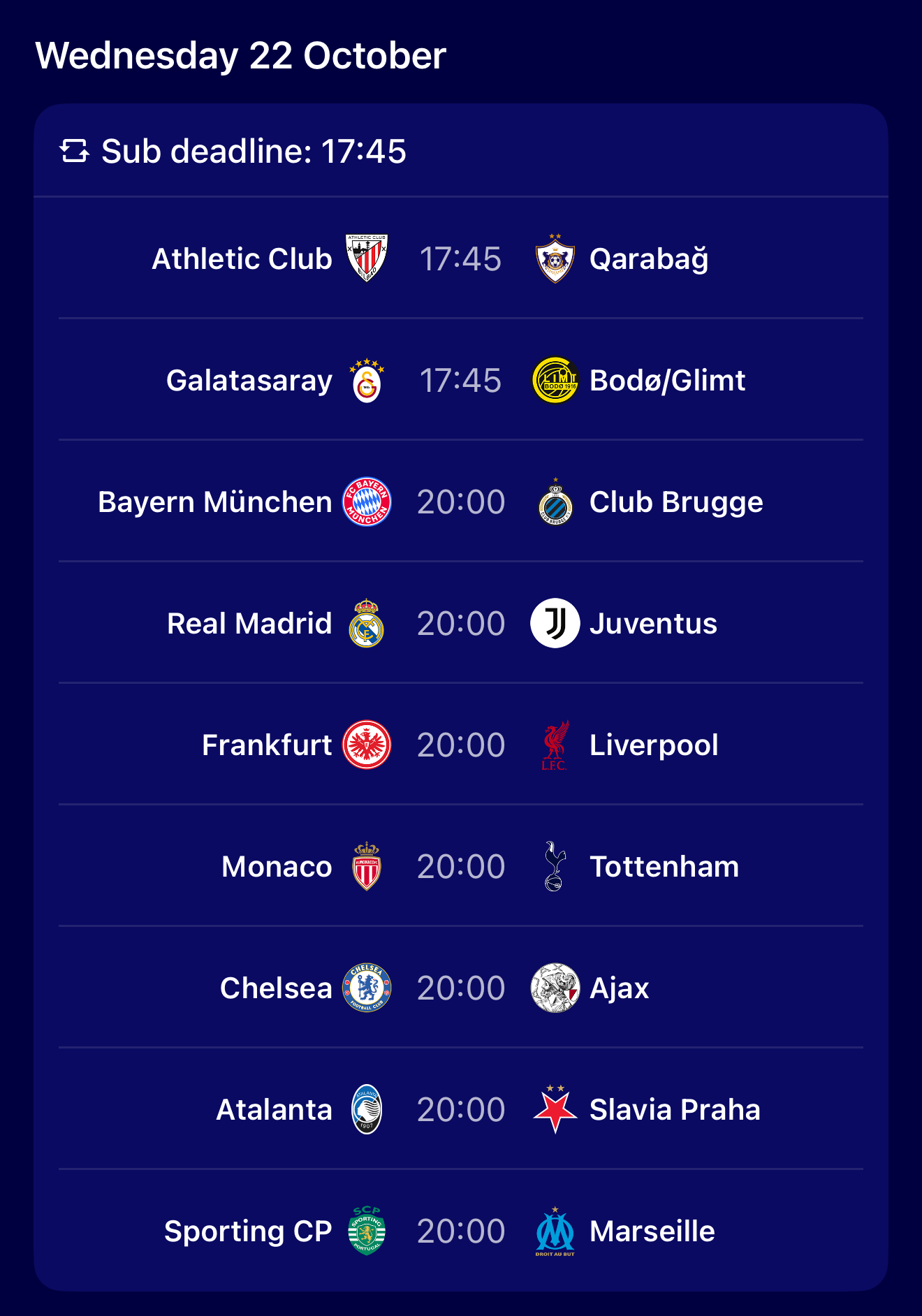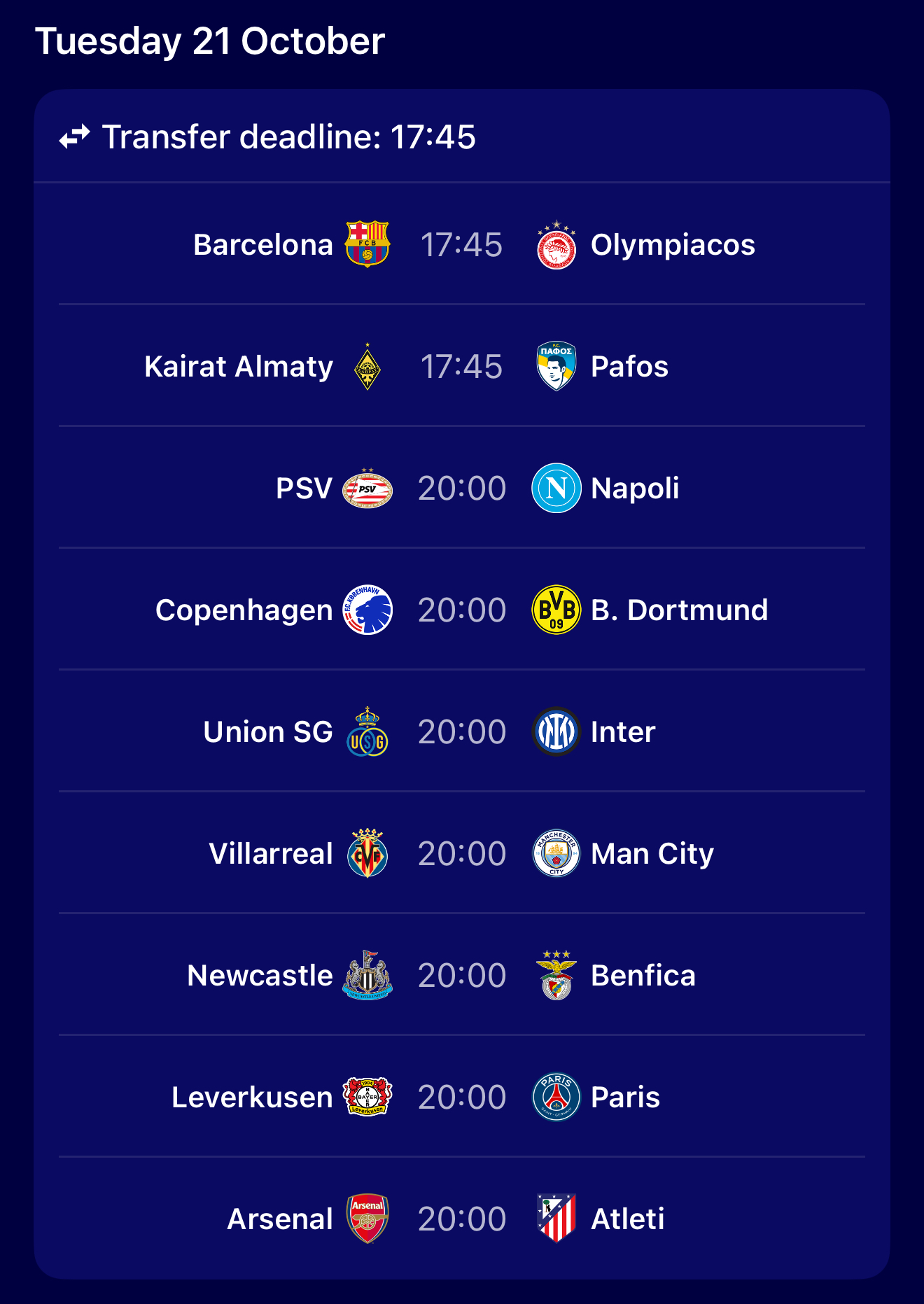 Deadlines are subject to change and will be at the time of kick-off of the first match of the matchday. So unlike FPL you do get to see the line-ups in advance and adjust accordingly. Just be aware that all 6 GW’s in the group stages now kick off with two early games so the deadline each time is 5.45pm UK time. Which also means you get to see the team sheets for four teams, not the full lot as in previous (and better!) seasons.