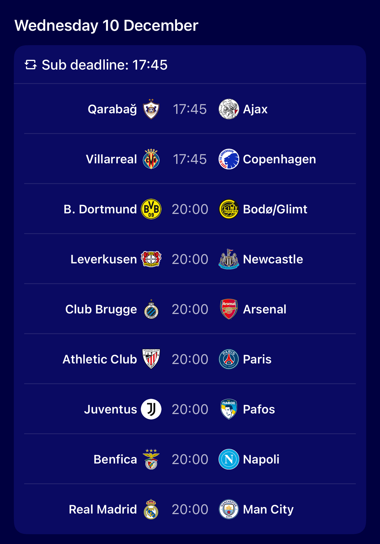 Deadlines are subject to change and will be at the time of kick-off of the first match of the matchday. So unlike FPL you do get to see the line-ups in advance and adjust accordingly. Just be aware that all 6 GW’s in the group stages now kick off with two early games so the deadline each time is 5.45pm UK time. Which also means you get to see the team sheets for four teams, not the full lot as in previous (and better!) seasons.