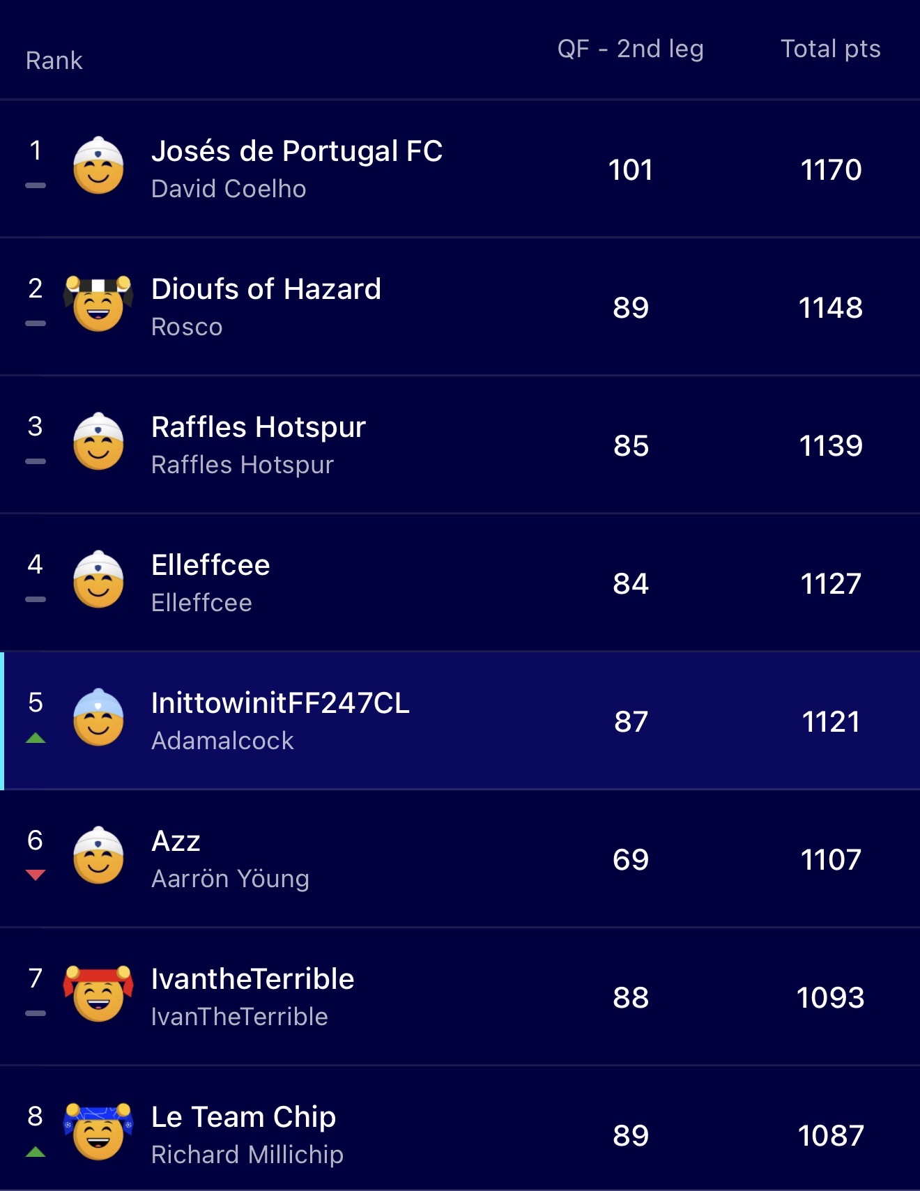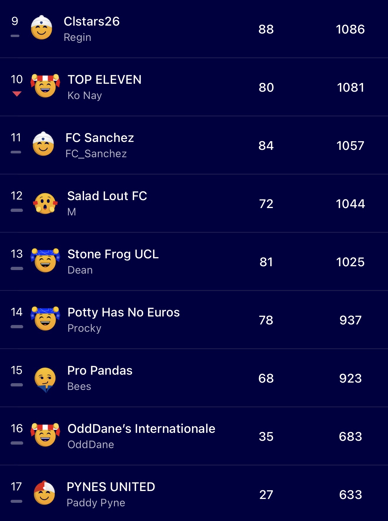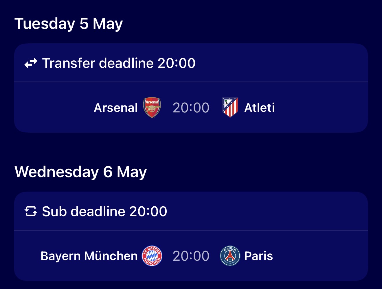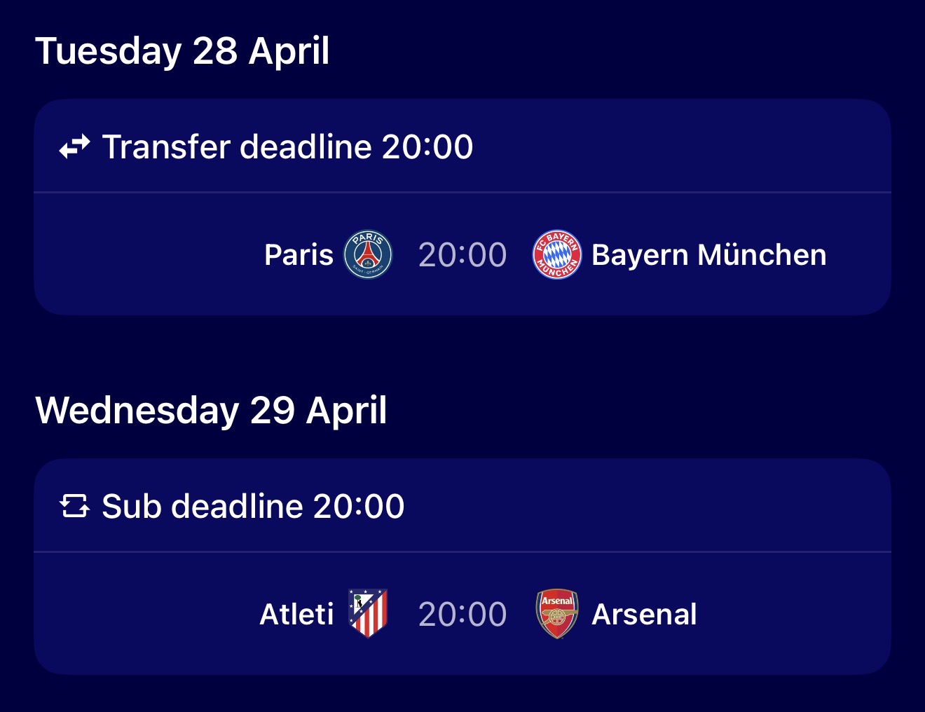 Deadlines are subject to change and will be at the time of kick-off of the first match of the matchday. So unlike FPL you do get to see the line-ups in advance and adjust accordingly. Just be aware that all 6 GW’s in the group stages now kick off with two early games so the deadline each time is 5.45pm UK time. Which also means you get to see the team sheets for four teams, not the full lot as in previous (and better!) seasons.